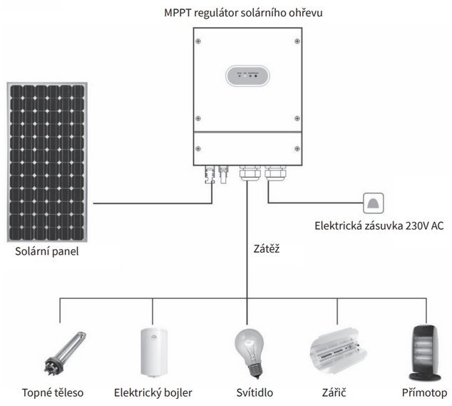 Menič dokáže efektívne premeniť energiu z fotovoltaických panelov na striedavý prúd, ktorý je vhodný na napájanie odporových vykurovacích zariadení. V prípade poklesu slnečného žiarenia pod určitú hranicu automaticky prepne na záložný sieťový zdroj, takže ohrev vody prebieha bez prerušenia. Vďaka vysokej účinnosti a vzdialenému monitoringu cez Wi-Fi je ideálnym riešením pre domácnosti aj rekreačné objekty.