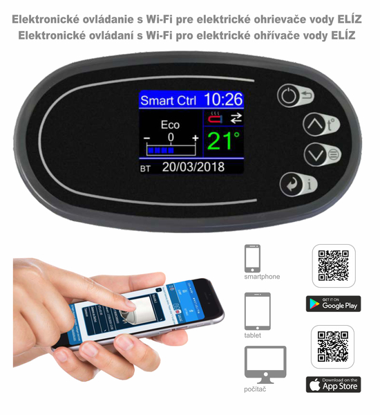 Pomocou ovládacieho panela s displejom viete pohodlne nastaviť požadované režimy. Displej zobrazuje nastavenú a aktuálnu teplotu vody, čas, informáciu o stave anódovej ochrany a signalizáciu prebiehajúceho ohrevu. Elektronika si zachováva nastavené údaje v pamäti aj v prípade výpadku elektrického napájania. Elektroniku ohrievača je možné ovládať pomocou WIFI.