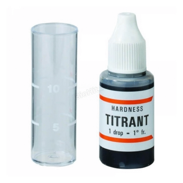 3. Pridajte Titrant po kvapkách a po každom pridaní dobre zamiešajte. Počítajte kvapky až do zmeny farby z červenej na zelenú. V 5 ml vzorke vody každá kvapka zodpovedá hodnote 1°dH, v 10 ml vzorke každá kvapka zodpovedá hodnote 0.5°dH.