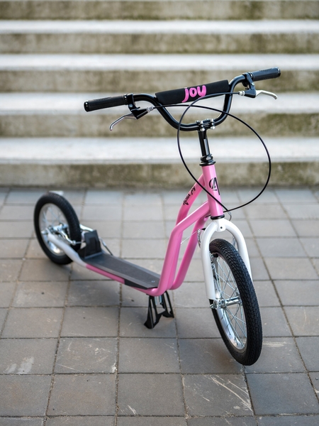 Kolesá sú nafukovacie. Predné koleso má rozmer 16", zadné je menšie a má veľkosť 12". Kolobežka vám počas jazdy zaistí komfort. Pevné riadidlá majú gumové rukoväte pre pohodlné a bezpečné držanie. Vďaka konštrukcii z kvalitnejodľahčenej ocele sa vám s ňou dobre zaobchádza.