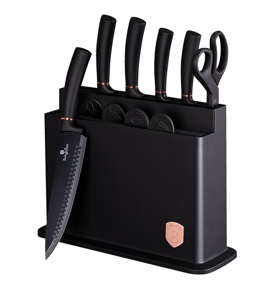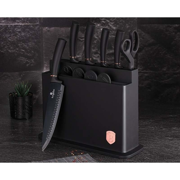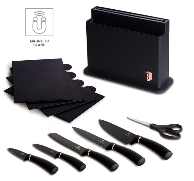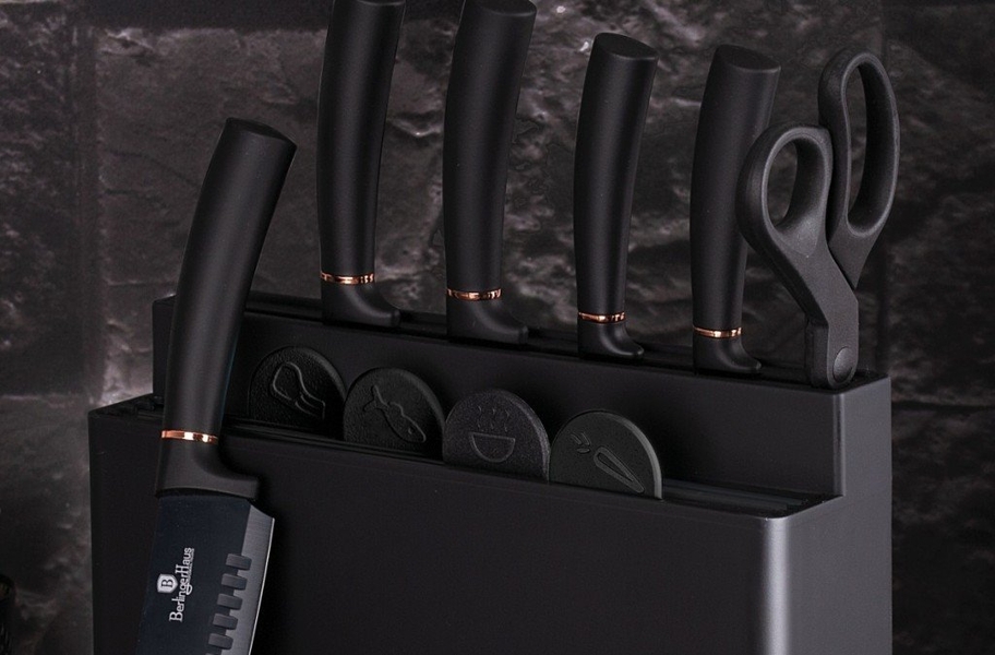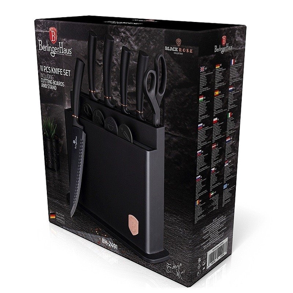 SadaBerlingerhaus Black Rose Collection sa skladá z 5 nožov, nožníc a 4 krájacích dosiek.Perfektne ostré čepele sú potiahnuté nepriľnavým povrchom. Vďaka laserovému brúseniu na nich krájané potraviny nelepia.Antibakteriálna úprava zaistí, že sa pri krájaní neprenáša nežiaduce pachy. Suroviny si navyše zachovajú všetky prospešné vitamíny a výživové hodnoty.Štýlový a do detailu zladený dizajn kolekcia Black Rose elegantne doplní každú kuchyňu.