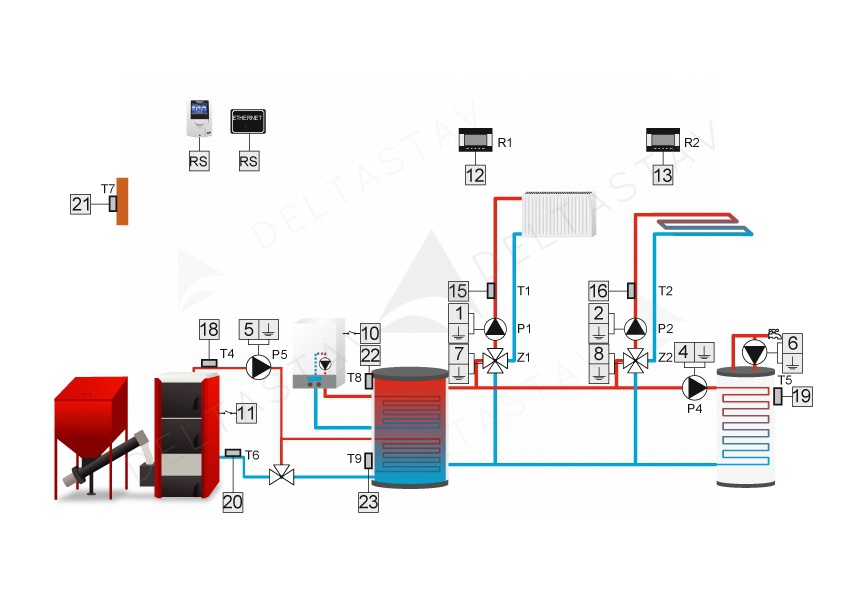 - spolupráca s izbovým regulátorom vybaveným RS komunikáciou, ktorý umožňuje okrem nastavenia denných a týždenných zmien teploty v miestnosti aj náhľad a zmenu teplôt zmiešavacích okruhov, TÚV, automatickú korekciu teploty (+ a -) ventila na základe zmeny teploty v miestnosti
