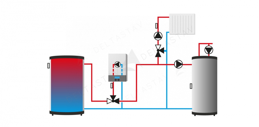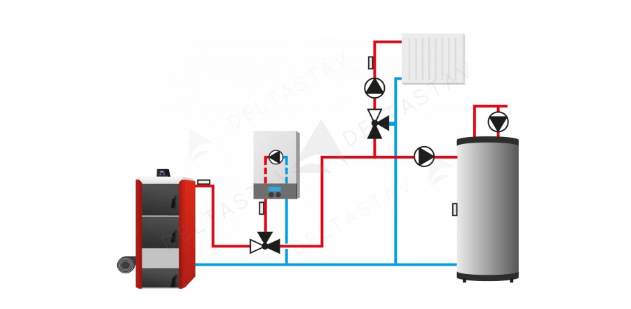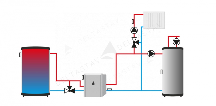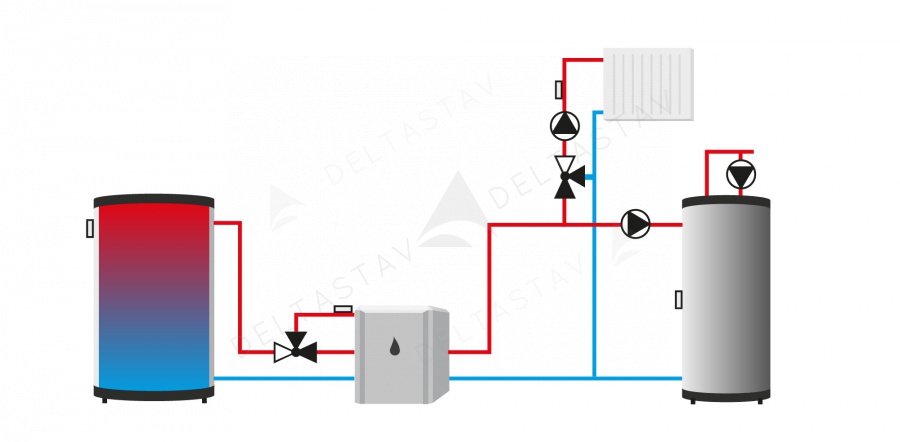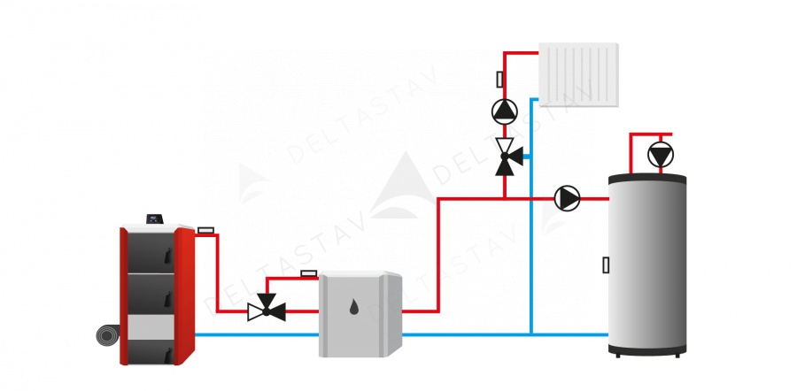 - ochrana pred nežiaducim nárastom teplej vody v krátkom obehu kotla a pred príliš nízkou teplotou vykurovacej vody pri návrate do kotla