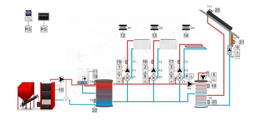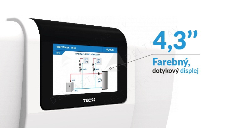 - spolupráca s izbovým regulátorom vybaveným RS komunikáciou, ktorý umožňuje okrem nastavenia denných a týždenných zmien teploty v miestnosti aj náhľad a zmenu teplôt zmiešavacích okruhov, TÚV, automatickú korekciu teploty (+ a -) ventila na základe zmeny teploty v miestnosti