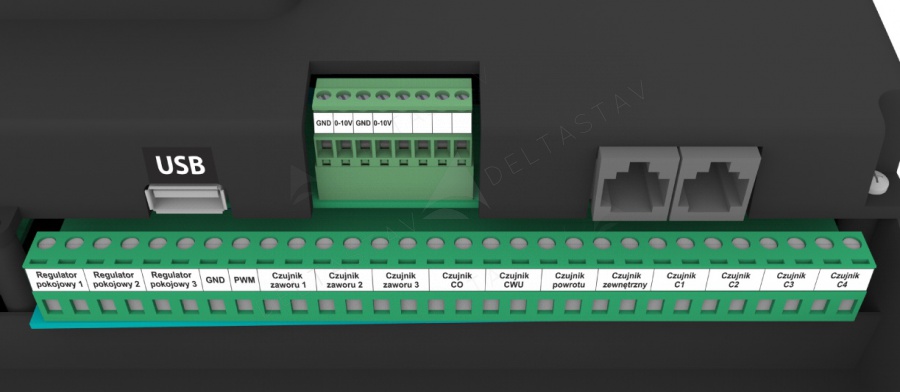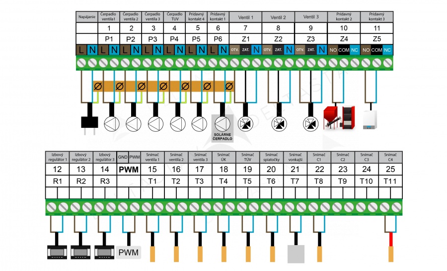 - ovládanie 3x servopohon, 3x čerpadlo, okruh TÚV, SOLÁR a 2x výstup 0-10V