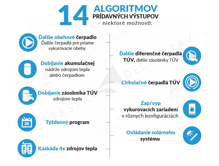 - štyri rovnako konfigurované výstupy pre vzájomné prepojenie zdrojov tepla alebo prácu výkonných prvkov na základe teploty a času (plynový kotol, elektrokotol, vykurovacia špirála, čerpadlá, ventily, akumulačná nádrž…) :