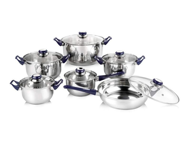 12dielna sada nerezového riadu CELESTE obsahuje: rajnicu 13,5 x 7 cm, hrniec 15 x 8 cm, hrniec 15 x 8 cm, hrniec 17 x 9,5 cm, hrniec 21 x 11,5 cm, panvica 21 x 6 cm. Hrnce, rajnica i panvu majú číre sklenené pokrievky s plastovými úchyty.Hrnce možno použiť na všetky typy varných dosiek mimo indukcie (dno neobsahuje chránič pre indukčné varné dosky).