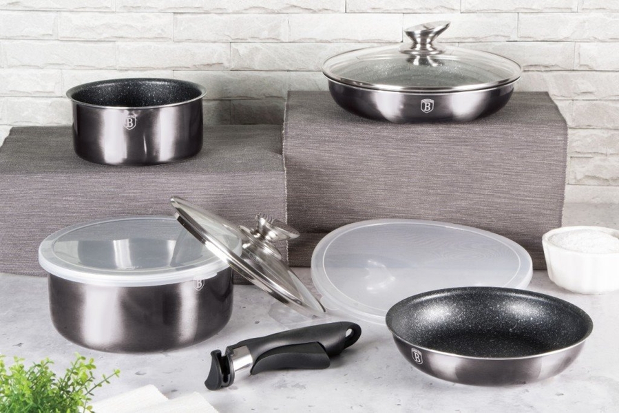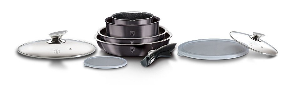 Trávite v kuchyni veľa času a je to na vašich hrncoch a panvičkách poznať? Zaobstarajte si jedinečnú sadu riadu Berlingerhaus z kolekcie Carbon PRO Line. Odnímateľná "click" rukoväť umožňuje použiť celú sadu v rúre bez toho, aby došlo k jej zničeniu. Jednotlivé panvice a kastróly zapadajú do seba a na všetky pasujú pokrievky, ktoré k zostave patria. Ušetríte množstvo úložného miesta v kuchyni. Turbo indukčné dno na riade zvýši efektivitu prípravy a rýchlosť varenia.