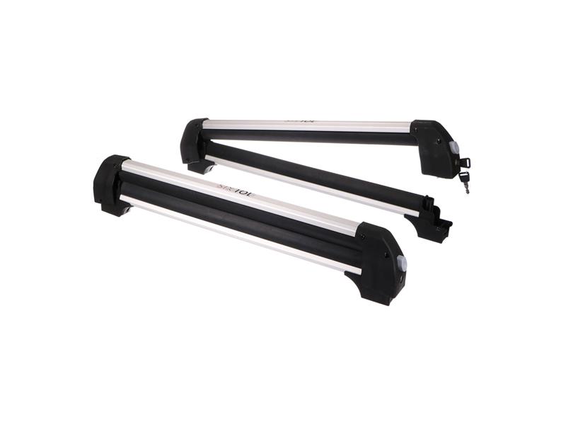 Sada: 2 kusov Šírka priečnikov: 76 cm Ložná plocha: 61 cm Maximálna nosnosť: 35 kg Typ upevnenia: na priečnikoch Šírka T-skrutky: 20 mm Uzamykateľný: áno, 2x kľúč Uzamknutie k vozidlu: áno Množstvo nákladu: 6 párov lyží alebo 4 snowboardy/wakeboardy/kiteboardy Materiál: hliník a odolný plast Hmotnosť: 3,95 kg Certifikácia: TÜV/SÜD - ISO PAS 11154:2006
