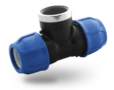 Mechanická tvarovka s možnosťou pripojenia závitovej armatúry. PE T-kus s vnútorným závitom 50x1"x50 s kovovým krúžkom.