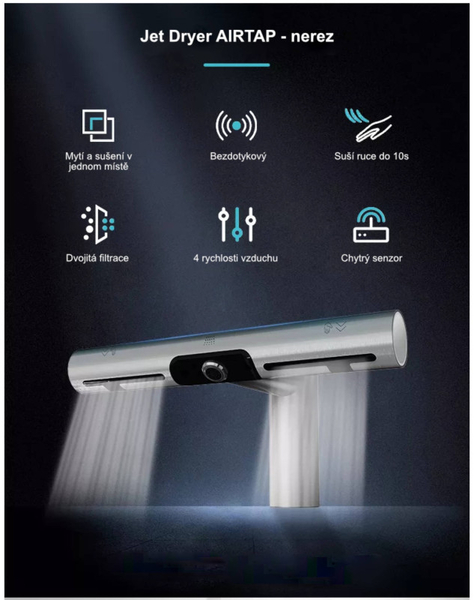 Inovatívny dizajn sušiča Jet Dryer AIRTAP - guľatá kombinuje tryskový sušič s automatickou vodovodnou batériou. Ruky si tak môžete pohodlne umyť aj vysušiť na jednom mieste – priamo v umývadle. Jet Dryer AIRTAP - guľatá je vybavený HEPA filtrom. Vodovodné batérie aj sušič je bezkontaktný pre maximálne hygienickú prevádzku. Vďaka tomu, že má každé umývadlo svoj sušič, prevádzka na toaletách je plynulá a bez front.