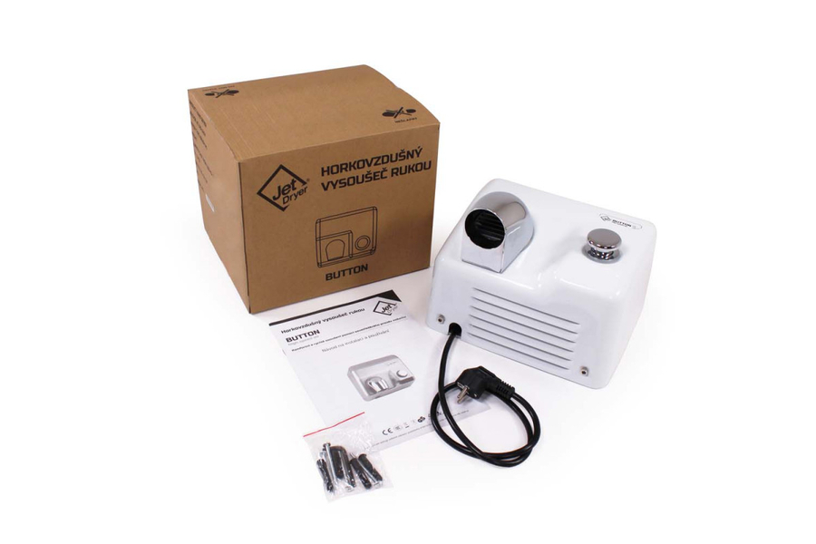 Telo sušiča Jet Dryer BUTTON je vyrobené zo silného a veľmi húževnatého kovu. Môžete si vybrať medzi prevedením z lakovaného kovu alebo nerezovej ocele. Kryt je fixovaný pomocou bezpečnostných skrutiek. Pod sušič nie je možné nič zasunúť a strhnúť ho zo steny.
