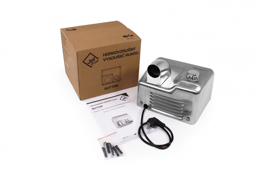 Telo sušiča Jet Dryer BUTTON je vyrobené zo silného a veľmi húževnatého kovu. Môžete si vybrať medzi prevedením z lakovaného kovu alebo nerezovej ocele. Kryt je fixovaný pomocou bezpečnostných skrutiek. Pod sušič nie je možné nič zasunúť a strhnúť ho zo steny.
