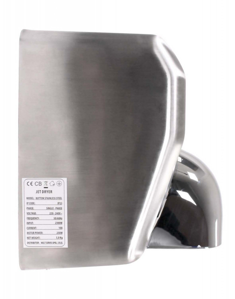 Výkonný sušič rúk v antivandal prevedení Jet Dryer BUTTON vás prekvapí rýchlym vysúšaním a otočnou tryskou. Môžete ho tak používať aj k usušení tváre alebo ako fén na vlasy.