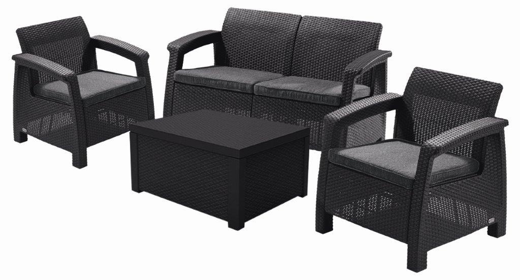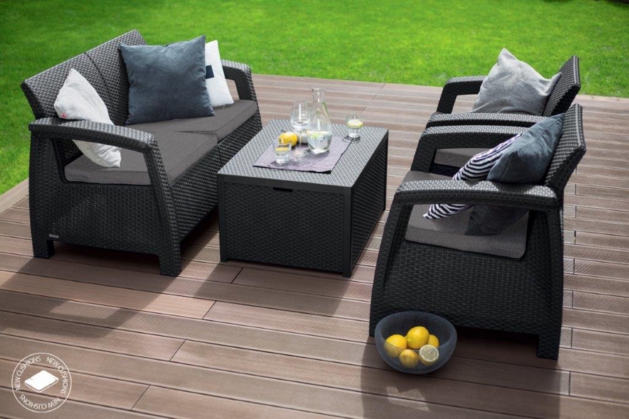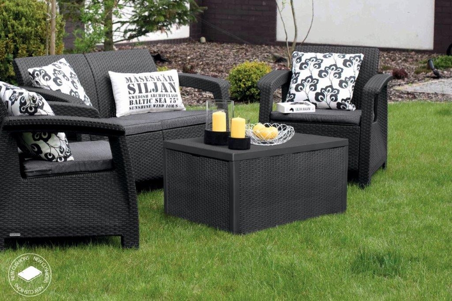 Záhradný nábytok Keter Corfu box set v grafitovom prevedení pripomína svojim dizajnom prírodnú ratanovú väzbu. Skvele tak doplní ako moderný, tak aj tradičné look okolia.